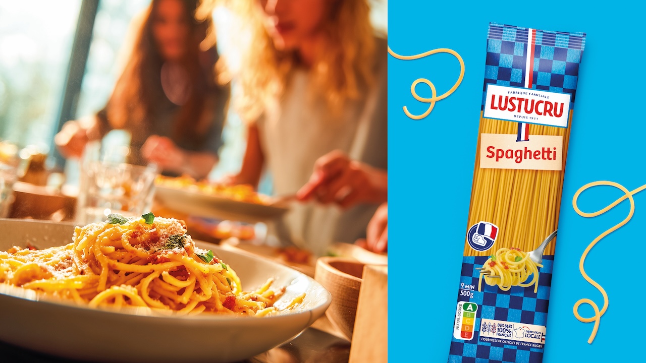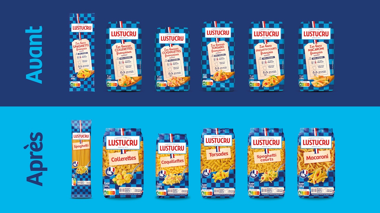 Face à la montée des marques italiennes premium, Lustucru nous a confié la refonte de sa gamme de pâtes sèches pour réaffirmer son ancrage français et familial. Nous avons consolidé les marqueurs patrimoniaux — le damier bleu et le logo Origin’ Info, gage de transparence et de traçabilité — et avons conçu un trompe-l’œil gourmand qui a simplifié la reconnaissance en rayon et renforcé l’appétence. Fidèles à la démarche engagée depuis 2022, nous avons fait passer les packs au 100 % papier recyclable, sans film plastique, prouvant qu’un emballage responsable peut être hautement désirable. Le système, cohérent et homogène à l’échelle de la gamme, a amélioré lisibilité, repérage et mémorisation en linéaire.